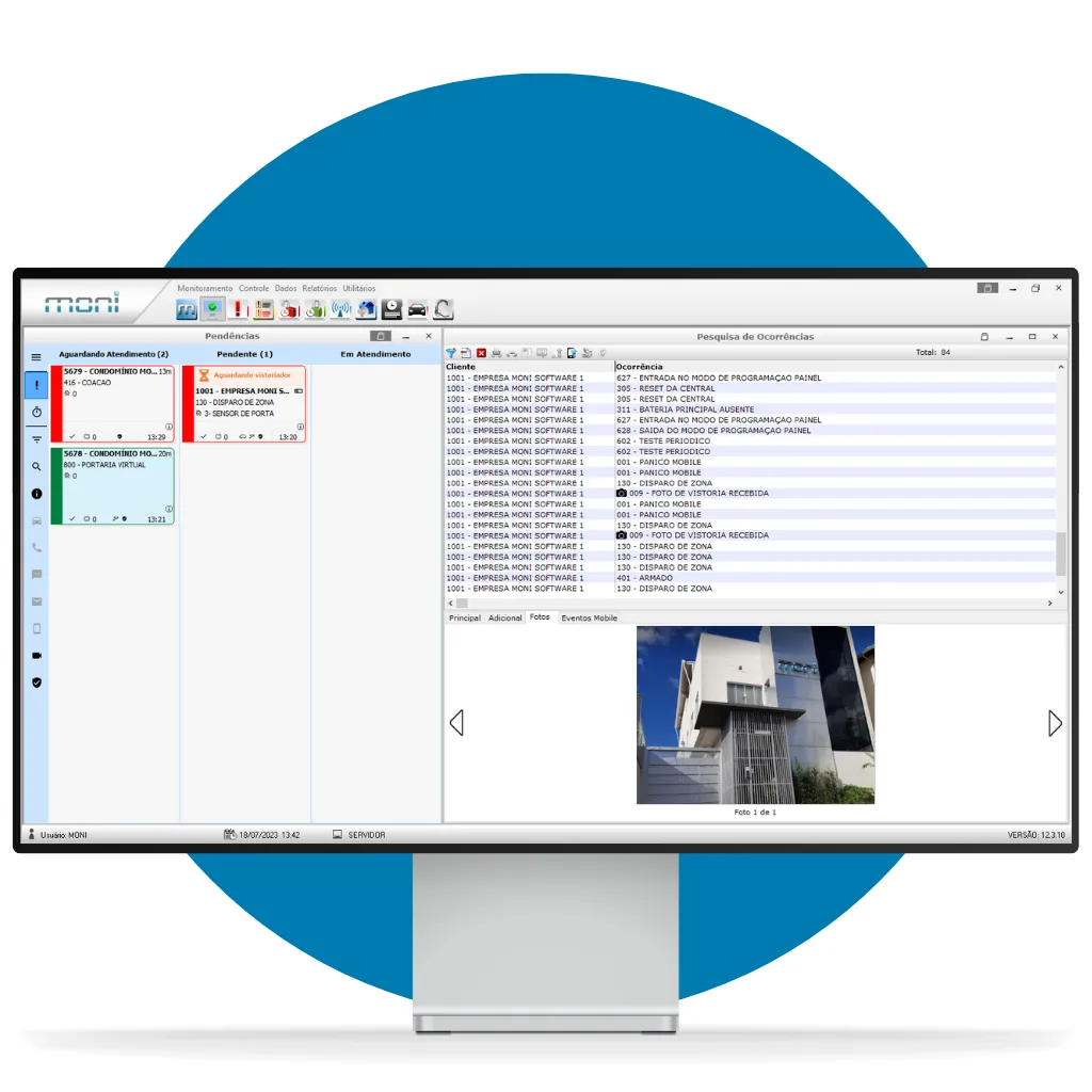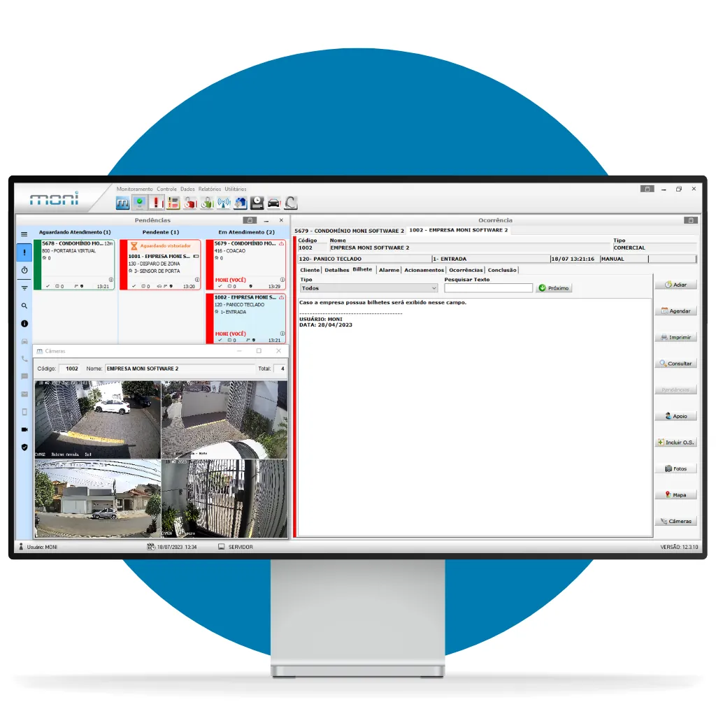 No momento que a central de alarme gerar um evento o mesmo é encaminhado para o Moni e poderá abrir instantaneamente com os dados do cliente e também as imagens das câmeras de forma automática para facilitar a operação. Na própria tela do evento, o usuário poderá consultar as informações do cliente, como os nomes, telefones, palavra-chave, fotos e outros.